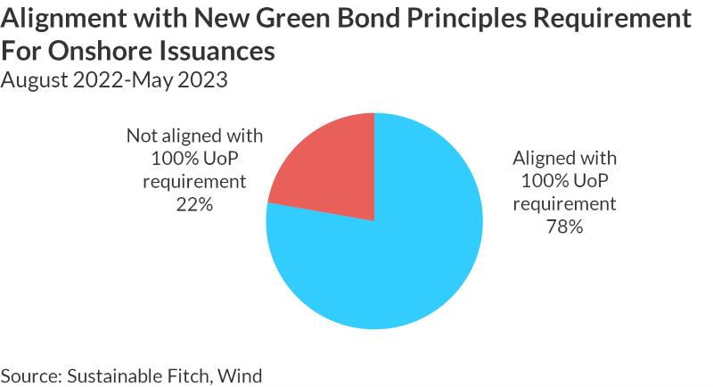 Onshore green bonds have shown noticeable improvements in terms of allocating bond proceeds to eligible projects since July 2022. The China Securities Regulatory Commission (CSRC) and the People’s Bank of China (PBOC) published the new Green Bond Principles, setting stricter standards requiring 100% of bond proceeds to be used on green projects.