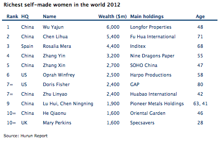 Property tycoon Wu Yajun, 48, takes the crown as the richest woman in China and the world’s wealthiest self-made woman in 2012, with a personal fortune of $6 billion. Wu is followed by Chen Lihua, 71, also a property developer, who has personal assets valued at $5.4 billion.