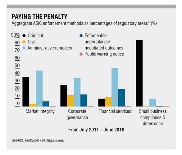 Research into enforcement trends conducted by the University of Melbourne last year found that only 11% of ASIC’s total outcomes in the five years to June 2016 were criminal in nature, and a vast majority of these were against small businesses.